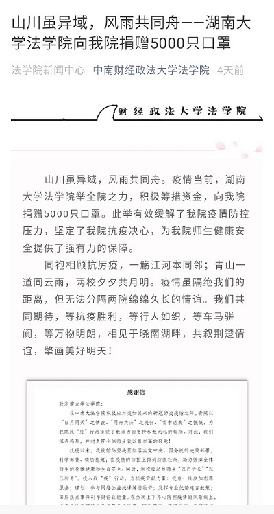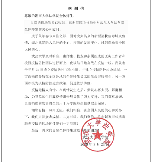 武汉是抗击新冠肺炎疫情第一线,是全国人民牵挂所在。“一江同源,情义相连”,武汉兄弟院校更是湖南高校关注的重点。为表达共抗疫情的决心、送达兄弟院校的爱心,威廉williamhill体育近期专门向武汉高校威廉williamhill体育赠送抗疫物资。其中,首批向武汉大学威廉williamhill体育捐赠口罩5000个,向中南财经政法大学威廉williamhill体育捐赠口罩5000个,并专门向两校师生致信慰问。湖大威廉williamhill体育的义举获得了武汉高校的盛赞,“共饮一江水、同赏樱花开”的诚挚问候也让武汉师生深为认同 。武汉大学威廉williamhill体育、中南财经政法大学威廉williamhill体育热情洋溢回信致谢,介绍了各校抗疫情势,感谢湖大威廉williamhill体育以“日月同天”之情谊、“同舟共济”之关怀、“雪中送炭”之慷慨,为武汉高校战“疫”行动提供的鼎力支持和无私帮助。两地高校的精诚团结、守望相助谱写了一段爱心佳话。