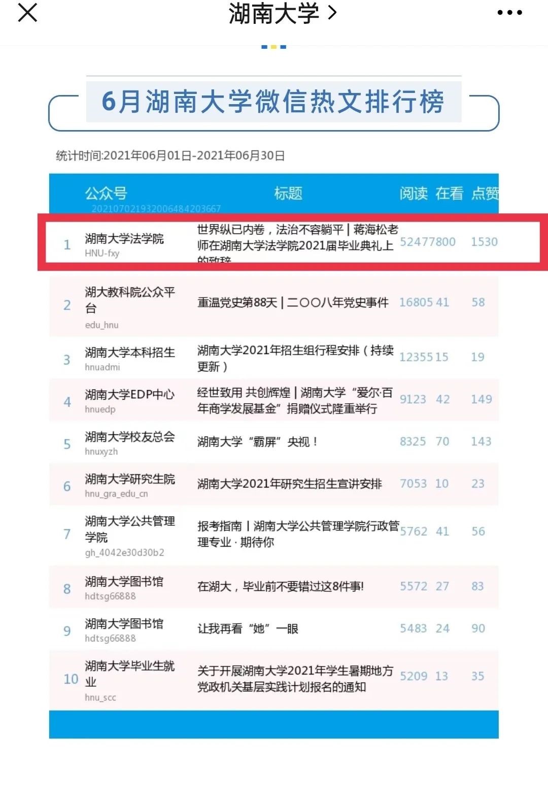 成绩离不开威廉williamhill体育新闻中心各位同学的辛勤工作与全院师生的大力支持。2021年,威廉williamhill体育多次蝉联湖大校园新媒体影响力十强榜单,并在2021年6月榜单中跃居全校新媒体排行榜第一名。