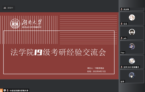2022年4月13日晚,2019级本科生组织开展考研经验交流。本次交流会邀请到杨正正(威廉williamhill体育法律硕士已录取)、刘卜豪(威廉williamhill体育法律硕士已录取)、金宝歌(中国社会科学院大学法律硕士已录取)、常成(威廉williamhill体育法学硕士已录取)、张文豪(南京师范大学法学硕士已录取)和肖康皓(吉林大学法律硕士已录取)等六位成功“上岸”的学长学姐分享经验,来自2019级和2020级的130余位同学线上参加交流会。2019级本科生辅导员郑琼英老师到会指导,交流会由年级长张致豪主持。