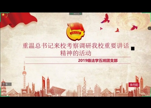 为确保把习近平总书记重要讲话精神转化为中国特色世界一流大学建设的有力行动,深入学习习近平总书记“七一”重要讲话精神。2021年9月14日,在团支书李丹阳同学的主持下,法学1905班顺利召开了“重温总书记考察调研公司重要讲话精神”线上主题团日活动。